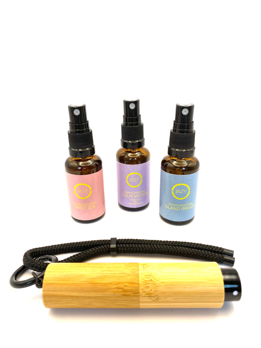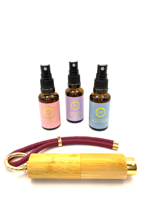 Unser Discovery-Kit beinhaltet unser JAZY O UNLIMITED in gold oder schwarz mit Schlaufengurt in einer Farbe nach Wahl. In Kombination dazu beinhalten dieses Kit auch unsere Handdesinfektionsmittel in drei unterschiedlichen Duftnuancen CALM WOODS, ISLAND BREEZE und SWEET JOY in praktischer Reisegröße und zum direkten Befüllen unseres UNLIMITED.